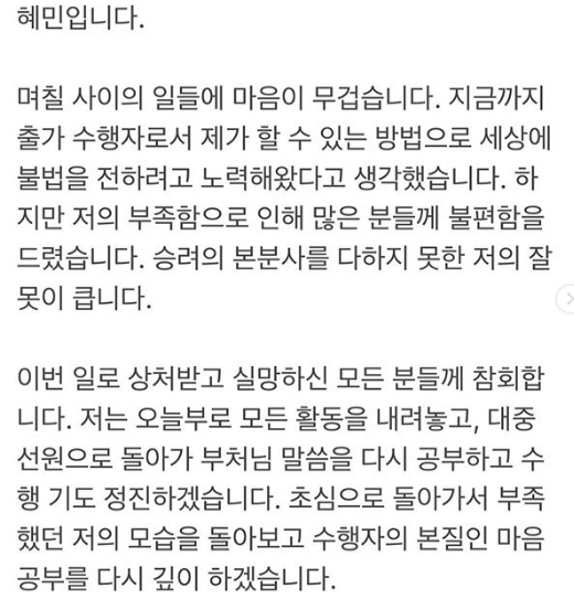 혜민스님 인스타에 11월15일 어제 글이 올라왔습니다.