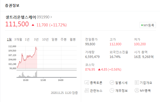 셀트리온헬스케어는 전일대비 11.72% 올랐다.