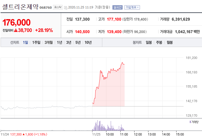 셀트리온 제약이 전일 대비 현재 11:19 기준 상한가에 육박하는 28.19% 상승했다.