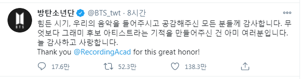 힘든 시기 그래미 후보 아티스트라는 기적을 만들어주신 건 아미 덕분이고 감사하고 사랑한다고 전했다.