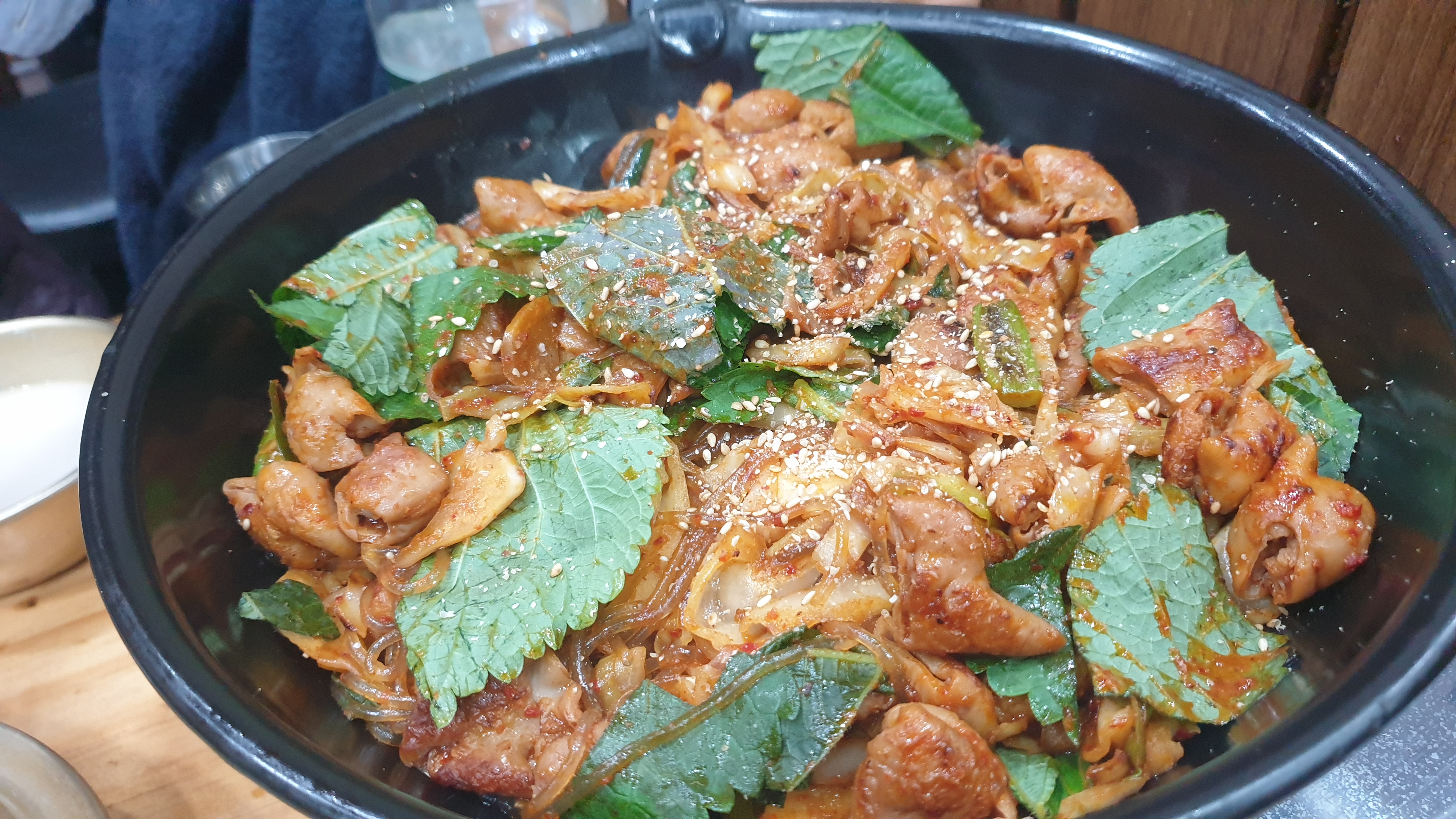드디어 기다리던 불곱창이 나왔습니다. 깻잎순도 아낌없이 넣어주셨네요
