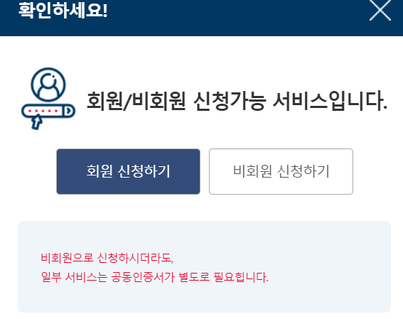 회원, 비회원 신청을 할 수 있으며 비회원의 경우 일부 공동인증서가 필요합니다.