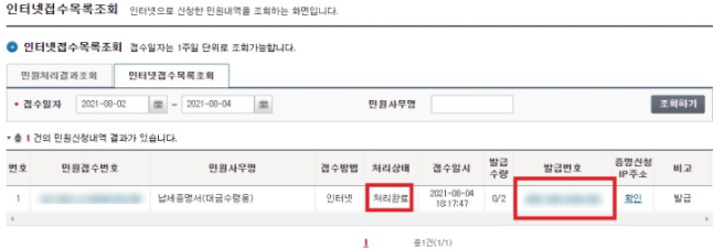 완료하고 나면 처리상태 처리 완료가 되면 발급번호를 클릭하면 출력이 가능하다.