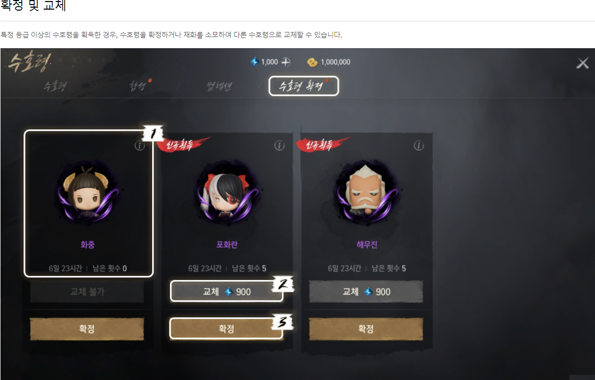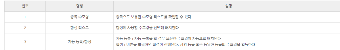 수호령은 동일등급 4개를 합쳐 일정 확률로 상위 등급의 수호령을 획득 할 수 있다.