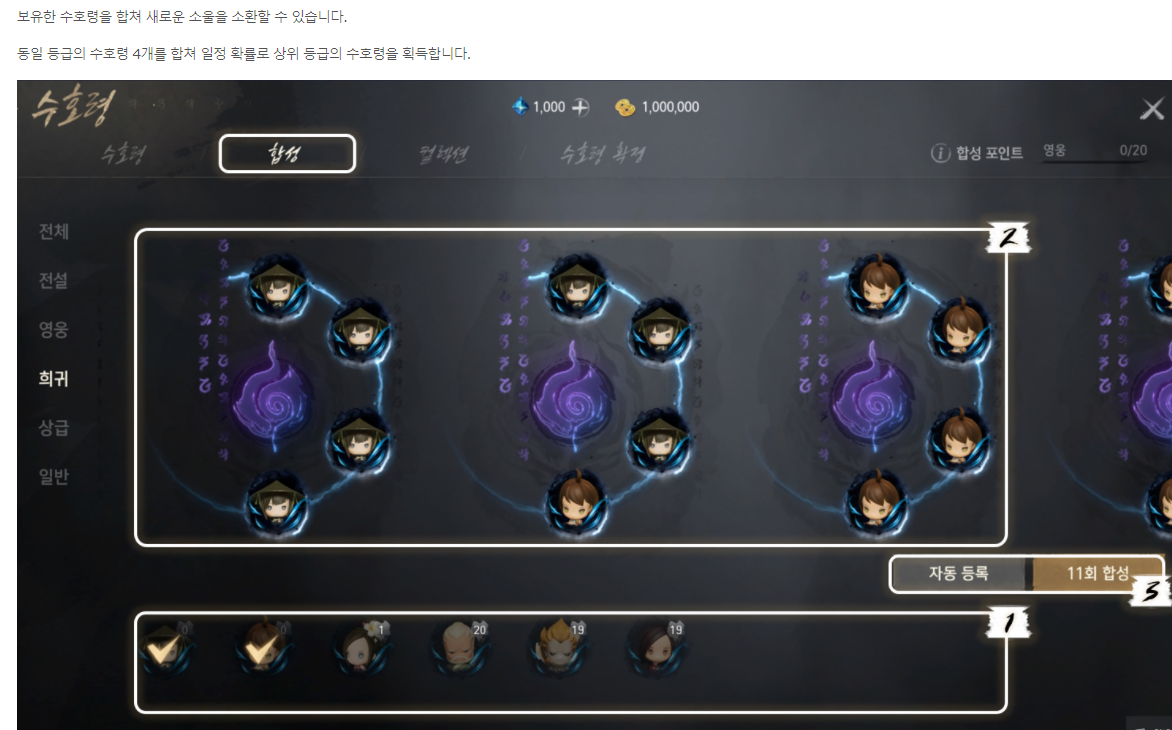 희귀/영웅 등급 수호령을 재료로 합성할 때 상위 수호령 획득에 실피하면 합성포인트를 얻게 된다.