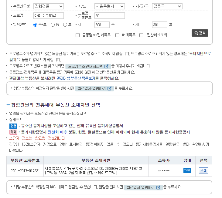 동호수까지 정확히 입력하면 아래 정보가 나온다