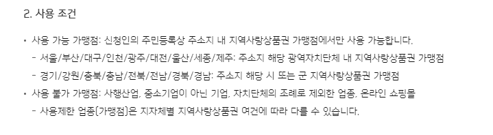 사용조건은 주민등록상 주소지 내 지역사랑 상품권 가맹점에서 사용 가능함