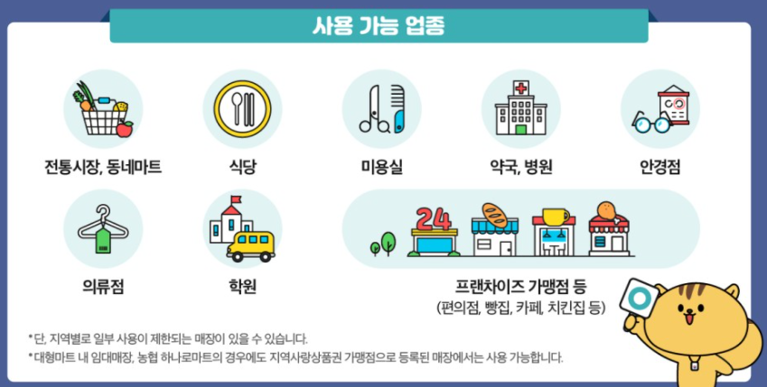 사용불가 업종이 워낙 많아서 배달은 못하니 식당에 가서 먹거나 시장 마트에 가서 직접 사와야 한다.