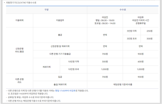신한은행도 영업시간은 농협과 동일하다. 영업시간 이후엔 금액에 따라 250원에서 1000원의 수수료가 부과된다.