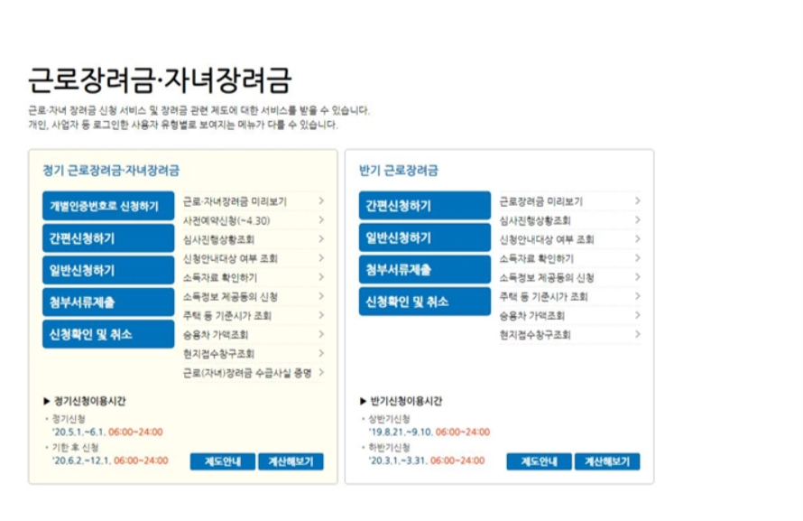 근로장려금은 '정기신청'과 상반기 하반기로 나누어 받는 '반기신청' 중 하나를 선택하여 신청이 가능하다.