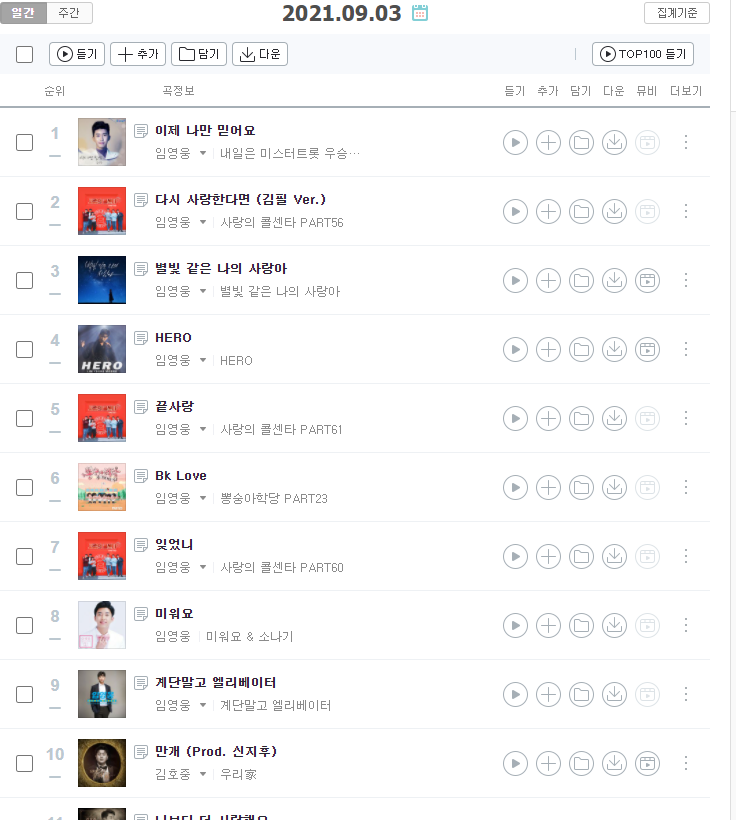 멜론 탑 100에서 임영웅의 나만 믿어요 순위를 보면
