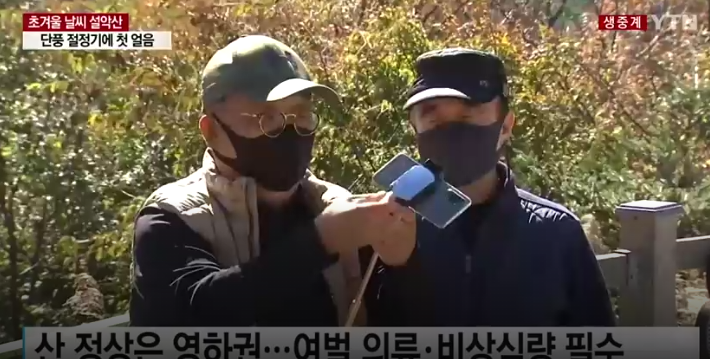 이번 설악산의 단풍 절정시기는 10월 17일로 이번 주말이었는데 때아닌 한파로 얼음이 얼었다.