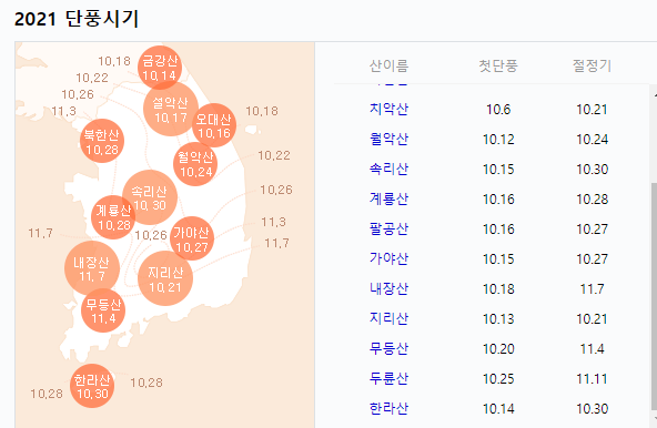 2021 단풍 절정시기 설악산 오대산 북한산 치악산 월악산 속리산 계룡산 등 바로가기