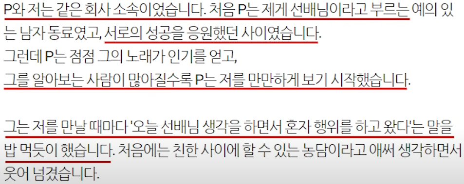 해당 게시글 작성자는 자신이 p의 소속사 선배였다고 밝혔다.