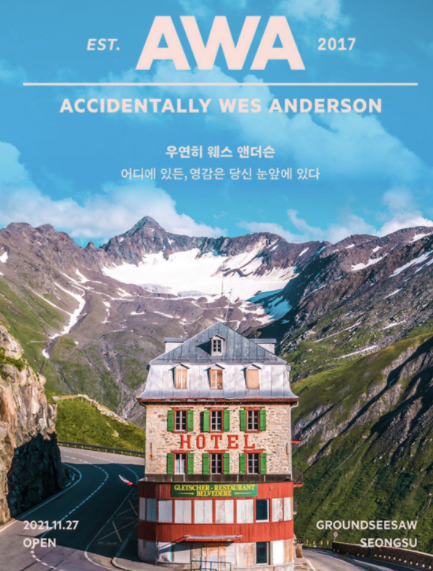그라운드시소 성수에서 개최되는 여행 사진 커뮤니티 우연히 웨스 앤더슨Accidentally Wes Anderson의 국내 첫 대규모 전시이다.