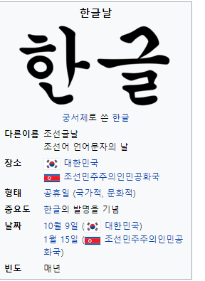 조선민주주의인문공화국에서는 이와 달리 세종대왕이 훈민정음을 창제한 날인 1월 15일을 조선글날로 정하고 있다.