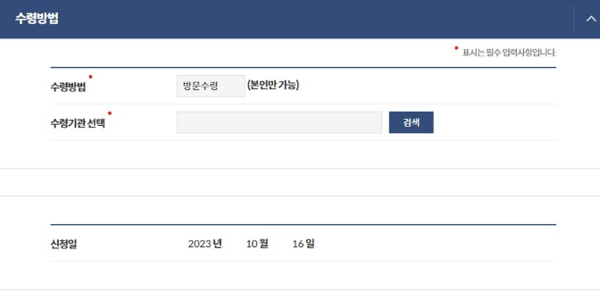 .수령방법과 수령기관을 선택 하면 신청을 할 수 있다.