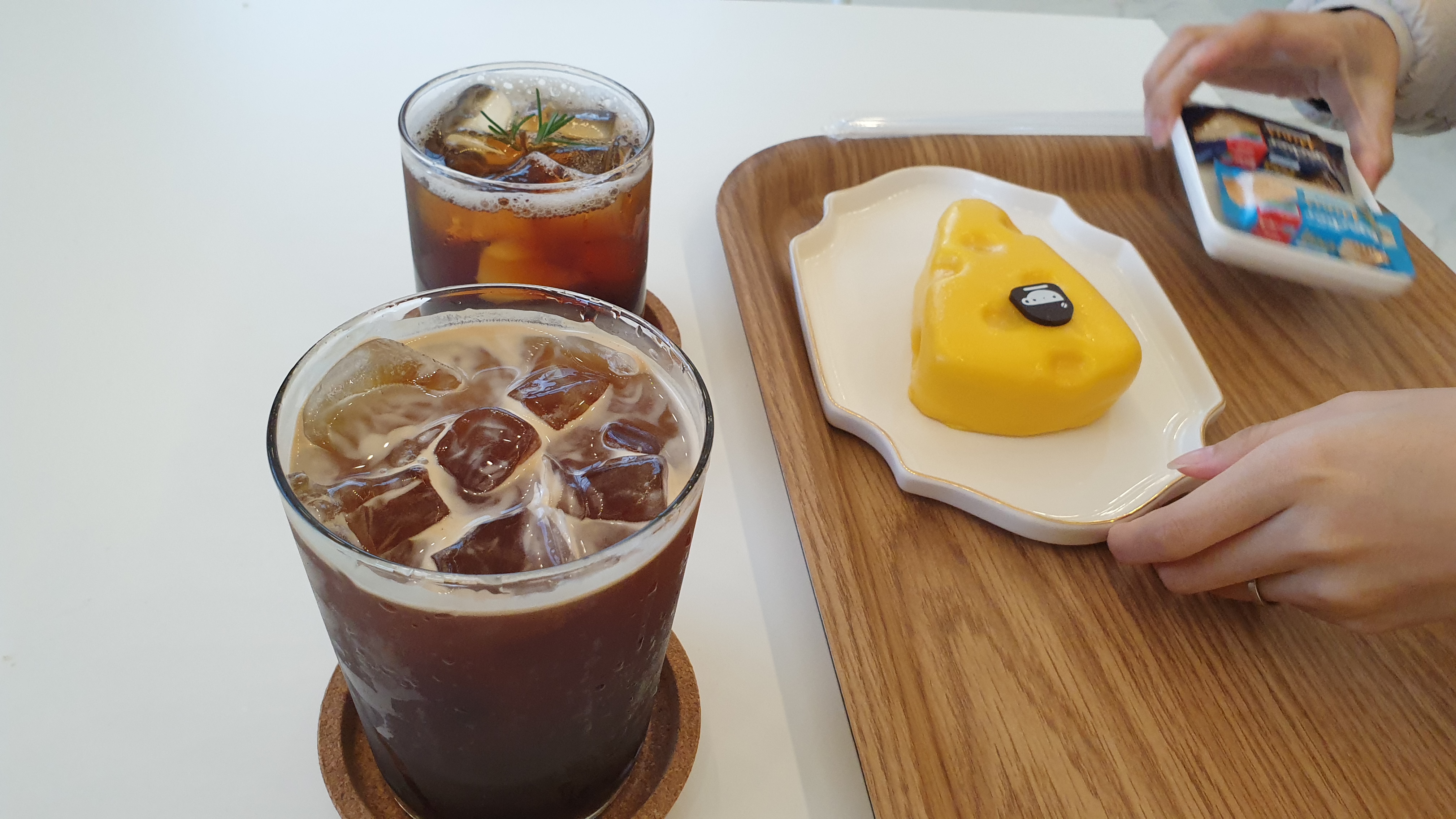 이날 먹은건 치즈케익과 아메리카노를 마셨어요. 겉이 화이트초콜릿으로 되어 있고 안에가 치즈케익입니다.