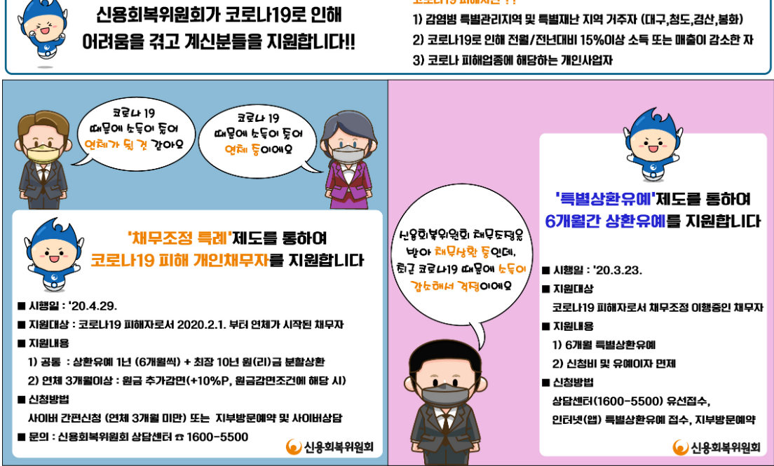 신용회복위원회가 코로나 19로 인해 어려움을 겪는 분들에게 특례제도를 마련했다.