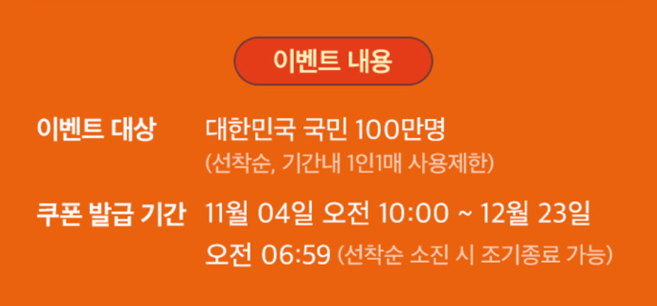 쿠폰 발급 기간은 11월 04일 오전 10:00~ 12월 23일 오전 06:59 까지다. 선착순 소진 시 조기종료 가능하다.