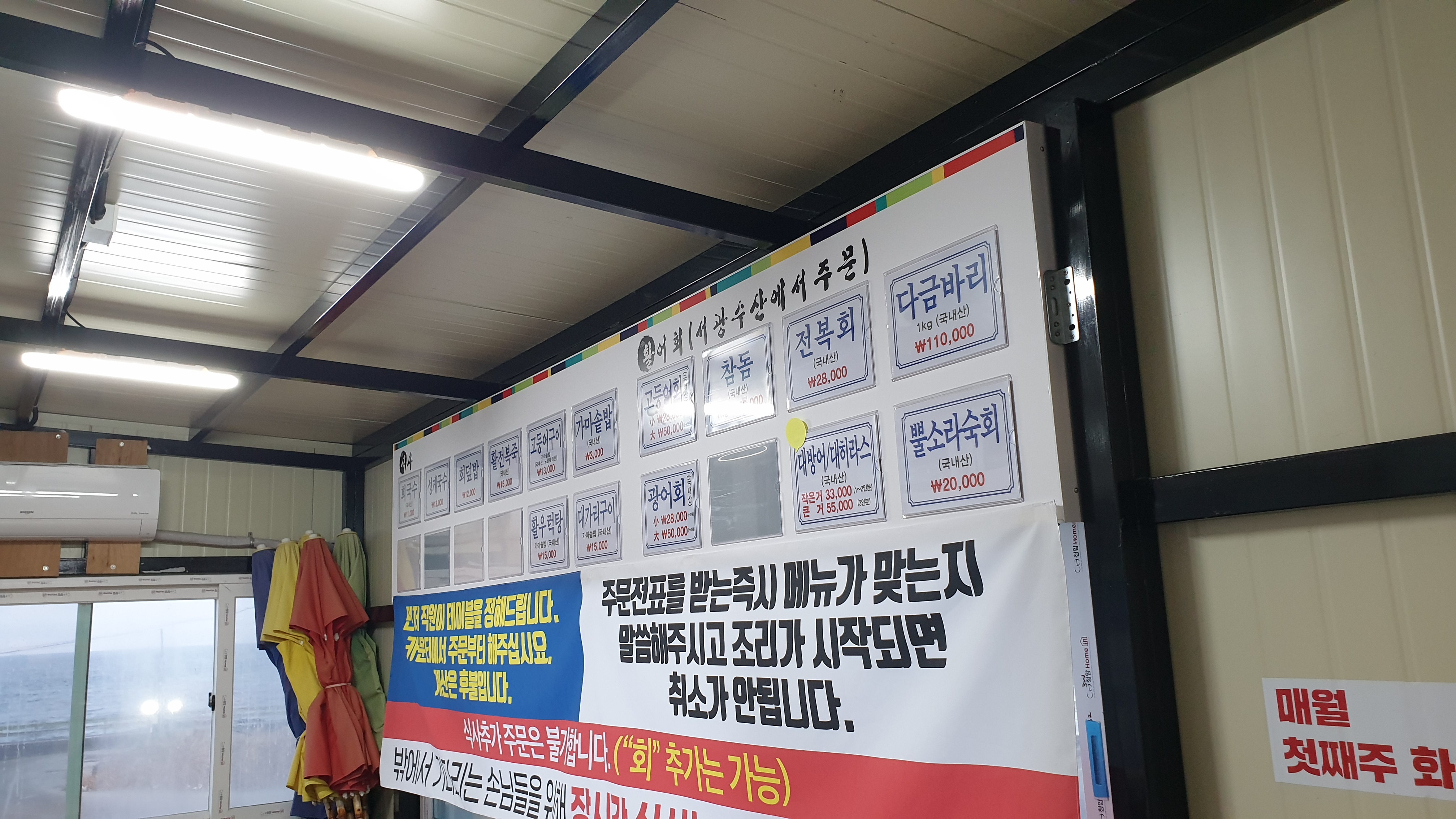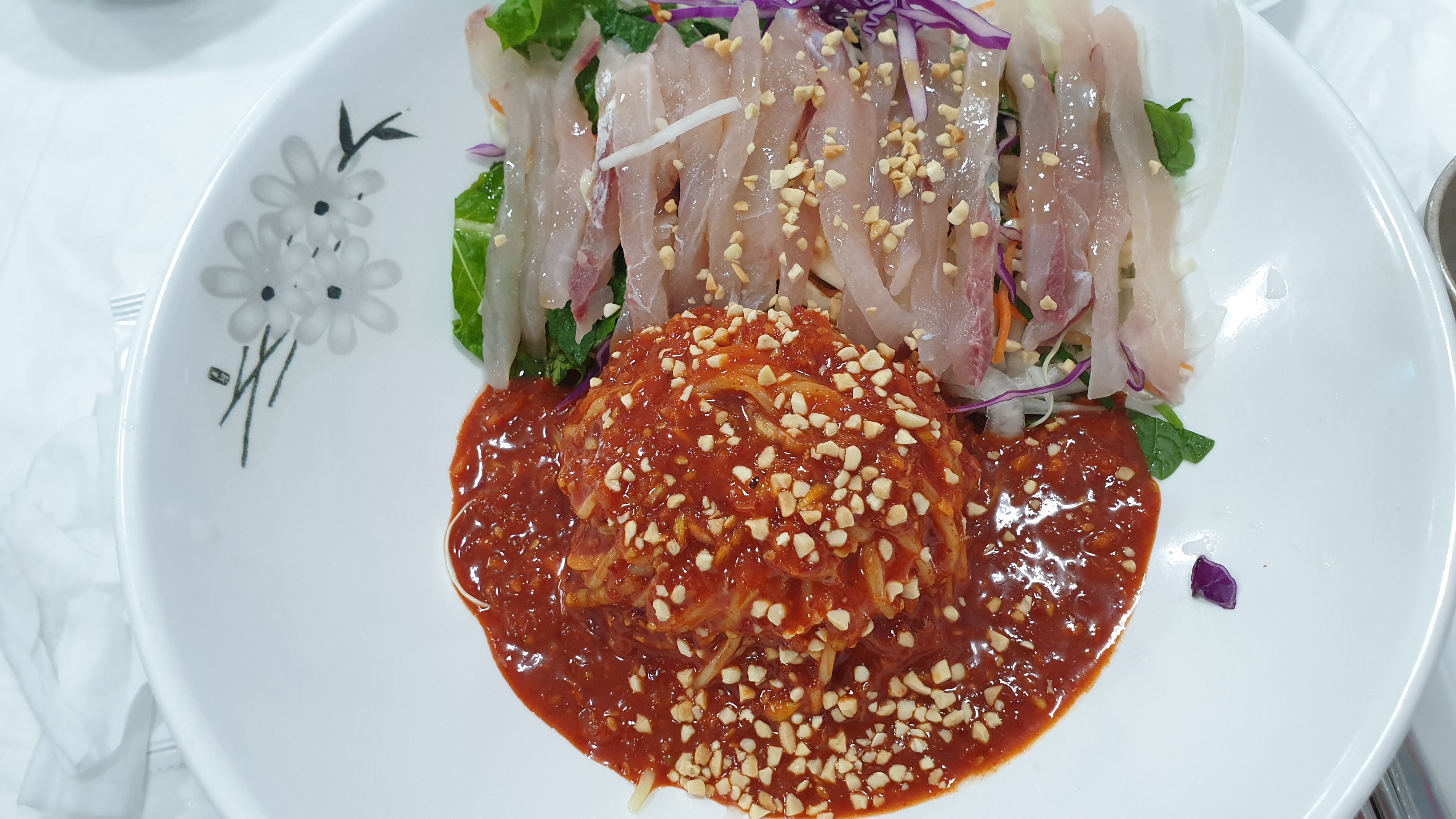 오션뷰가 보이는 배경에 맛있게 회국수와 고등어회를 저렴한 가격이 즐길 수 있는 곳입니다.